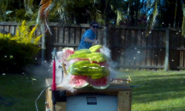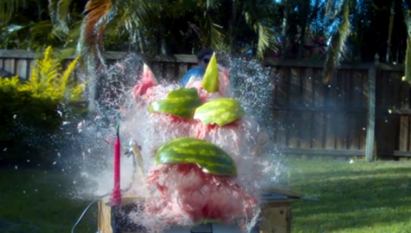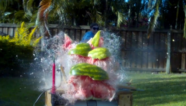 在实验中,他们找来四个巨大的电容器组合到一起,瞬间可以爆发出20000伏的高压。他们将电极的一端插入西瓜,一人离得远远的拉动开关,结果西瓜就像炸弹一样瞬间爆开,相当震撼。