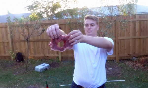 此外,他们还打算用这个设备去“烹饪”牛排,没想到,牛排并没有像想象中一样被烧焦,而是直接被击飞,中间还击穿一个大洞。