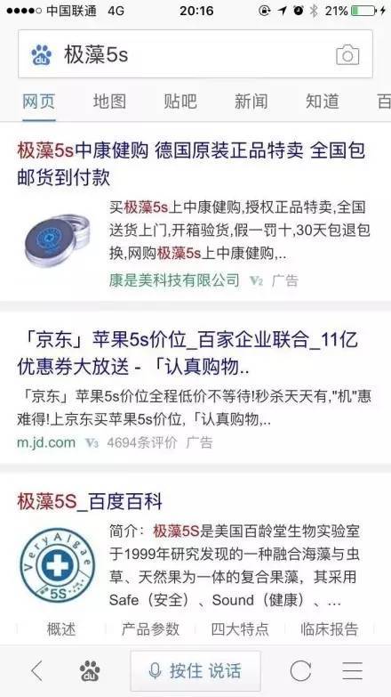 比如说这个一看就很扯的“极藻5s”,总会有用户为这些虚假内容买单。“魏则西事件”历历在目,我只想问一句: