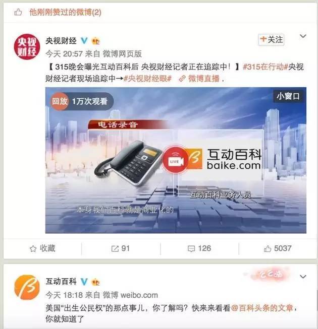 大概是公司内部没人看315,互动百科的回应并不够及时,当时官方微博还刚好发了这样一条信息: