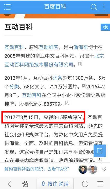 百度百科发挥了它多年以来坚持收看3·15晚会的作风,第一时间就把“互动百科”的百度词条给改了: