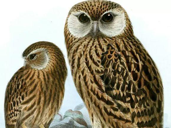 笑鸮:源自于新西兰,18世纪中期这种鸟类数量变得非常稀少,是新西兰独有一种猫头鹰物种,最终灭绝时间是20世纪30年代。最显著的特点是鸣叫非常像精神病患者的窃笑,由于人类活动破坏笑鸮的栖息环境,使得它们开始改变所吃食物,它们会吞食鸭子、蜥蜴,以及一些小型哺乳动物。