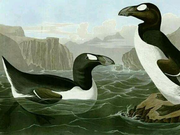 大海雀:一种古怪的黑白相间的不会飞行鸟类,也被称为“原始企鹅”,它们直立高度大约1米,但是翅膀非常小,仅有15厘米长。几百年前,数百万计的大海雀栖息在北大西洋海岸,但是由于它们繁殖能力非常低,每次只产一枚卵,并且暴露在地面上,很容易被掠走。它们灭绝的主要原因是人类捕杀,1844年宣布该物种灭绝。