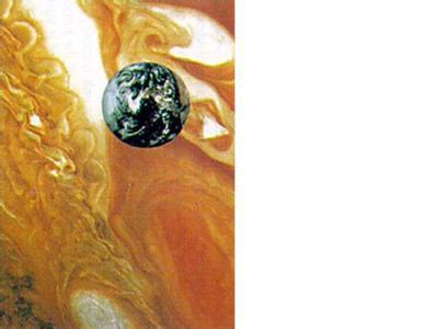离太阳第五近的行星——木星,与金星截然不同。木星是一个不停旋转的 气体球,主要由氢气和氦气组成。在木星的中心,也许存在一个固体核,淹没 在氢气海洋之中。木星的周围环绕着彩云带。有些云团可能是由水汽组成的, 但大部分云团不是,它们很可能是由带有刺激性气味的氨冰组成的。有些行星专家认为木星上会有风暴,而且有时很 猛烈。木星上的雨滴(或雪花)可能是 由氨晶体形成的,可以把它们看作是水晶,但是在落到木星表面 的氢气海洋上之前,这些冰晶就会液化, 然后蒸发到空气中。