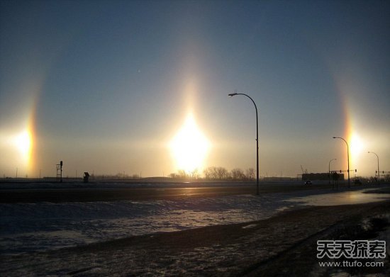 看起来像有三个太阳的外星球,实际上是“幻日”的日晕效应,因阳光穿过悬浮在空中的冰晶反射而形成