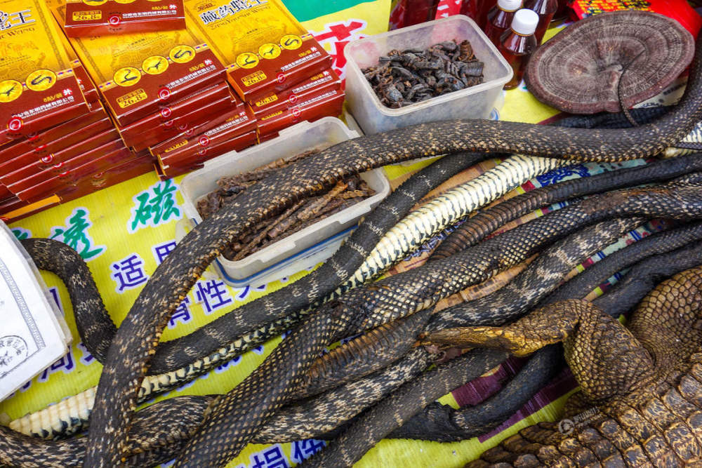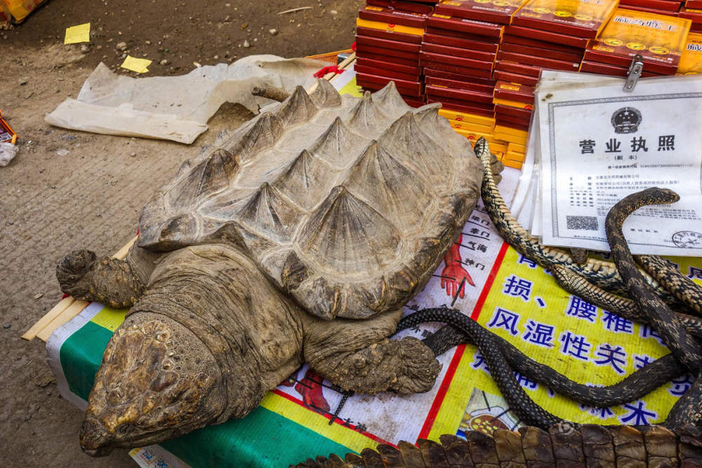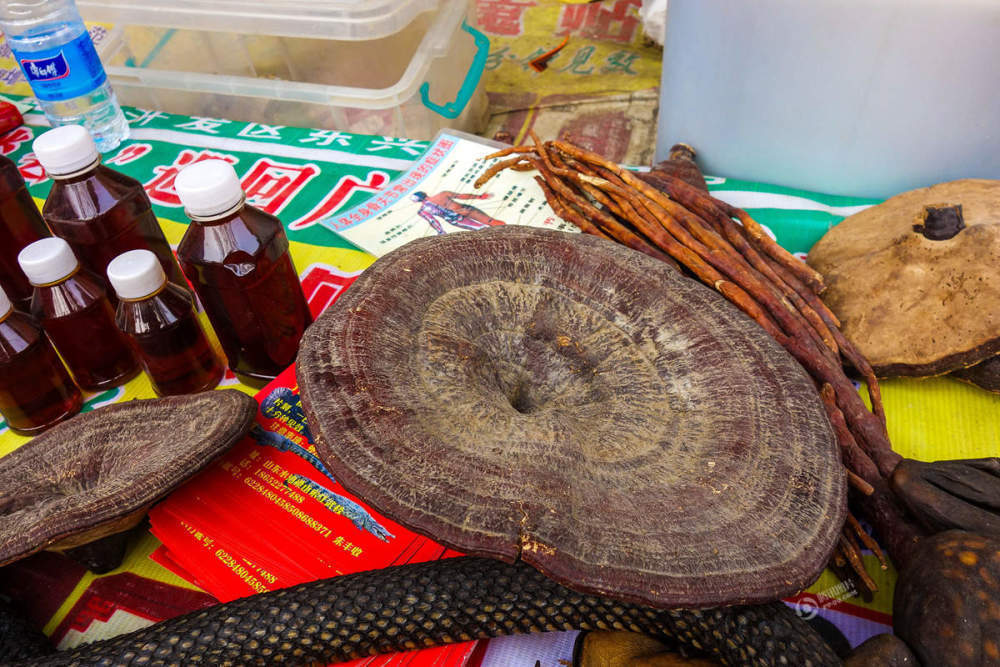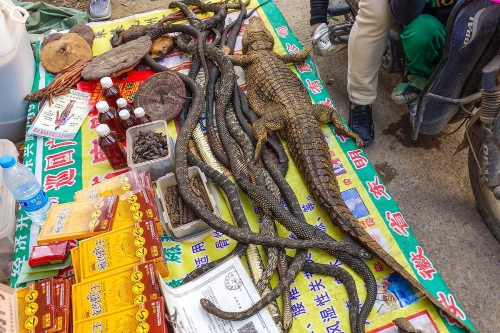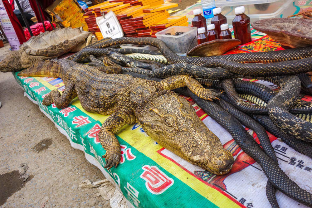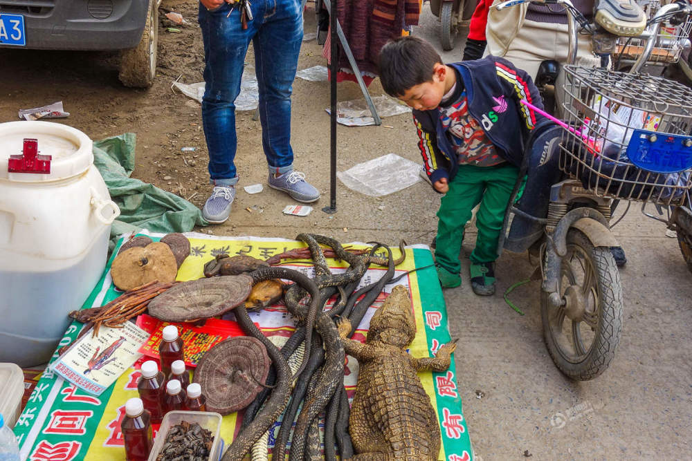 4月6日,江苏省徐州市,在铜山县西沿集市上,一名外地卖药小贩为招揽顾客,在地摊上摆放起疑似野生保护动物的鳄鱼、巨龟和蛇标本,引来赶集的路人驻足观看。