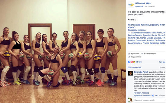报道,近日,来自意大利城市维琴察的“阿尔泰尔1963”排球队队员们为庆祝在D级排球锦标赛中夺冠,拍摄了一张半裸合照,发布在社交网站上。照片中,女队员们仅穿上衣和运动鞋袜,未穿裤子,隐私部位用排球遮挡。