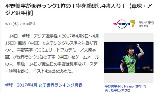 北京时间4月14日消息,2017年乒乓球亚锦赛在这个比赛日爆出大冷门,里约奥运会单打冠军丁宁被日本小将平野美宇大逆转,而这个结果不仅让中国球迷感到惊讶,也是被日本网友热议,在日本雅虎体育网站,平野美宇击败丁宁的新闻报道引发上千日本网友跟帖。