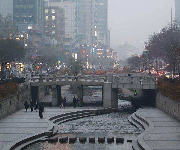 资料图片:雾霾笼罩韩国首尔的清溪川