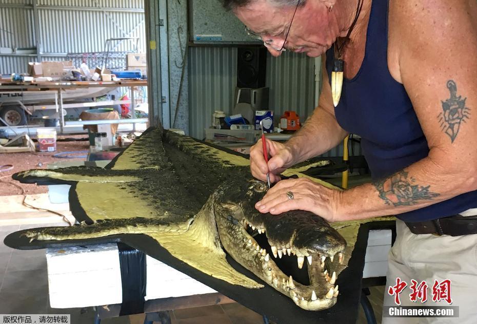 当地时间4月21日,澳洲达尔文,米克·皮特曼正在家中制作鳄鱼标本,修复鳄鱼眼睛。