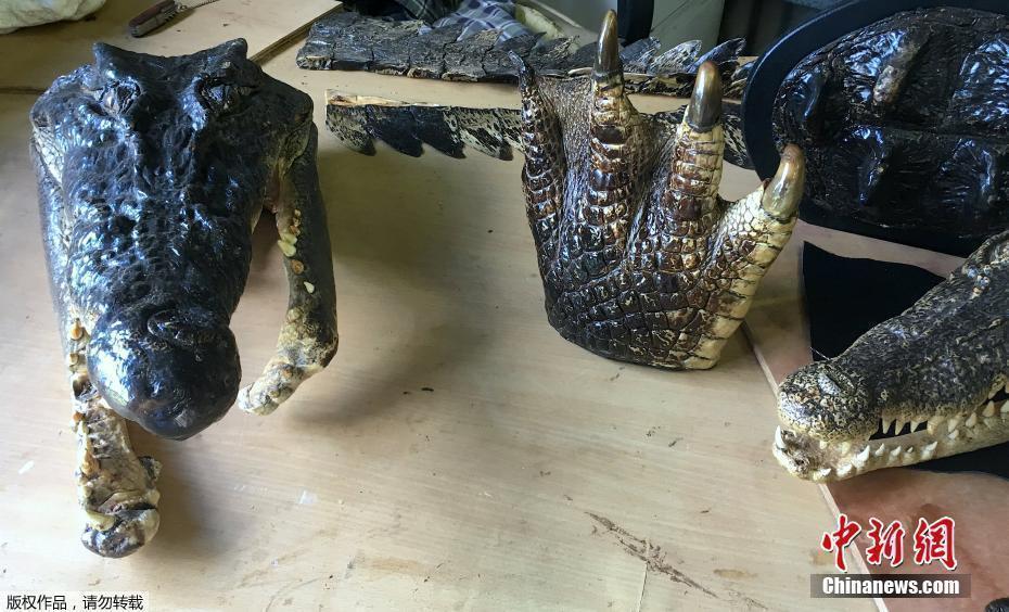 图为米克·皮特曼家中存放的部分鳄鱼标本。“鳄鱼米克”的一身绝技由继父和师父“德国杰克”传授,后者曾捕猎过4条巨鳄,还是猎鳄纪录保持者。