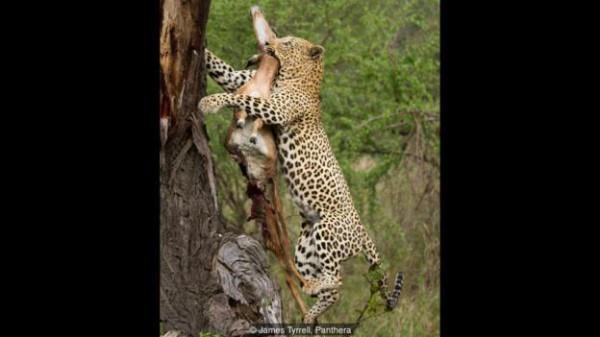一只豹子正把猎物带上树。(图片来源:James Tyrrell)