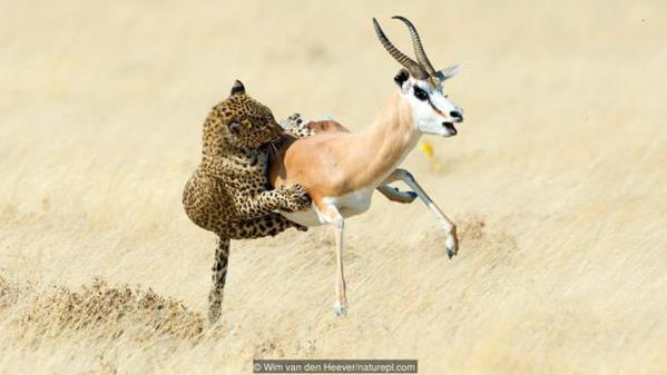 一只金钱豹正在袭击跳羚。(图片来源:Wim van den Heever/naturepl.com)
