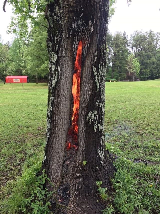 据James Spann介绍,这起雷击事件发生在阿拉巴马州,雷电并没有将大树劈倒,而是造成了几乎碳化的结果,大树内部像是一个熔炉一样,透出红红的火光。