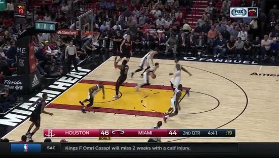 4分32秒,热火跑完一圈战术,维特斯出手,哈登没回来