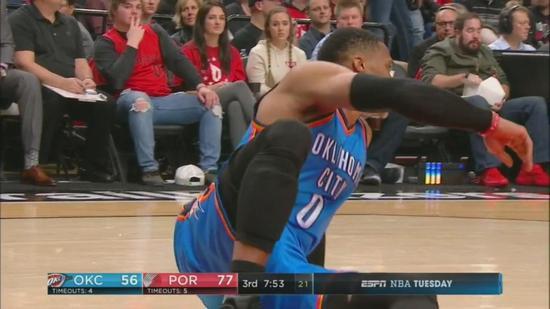 时常,维斯布鲁克在回防中看上去落后这么多是因为他在尽量快速喘息,这是可以理解的,考虑到他要承担雷霆进攻端太多的工作,他需要偶尔休息一个回合喘口气。而其它时候,身为运动狂人的维斯布鲁克会出现丑陋难看的摔跤,或是脸被打到,导致他无法恢复比赛状态,只能原地先停一下。