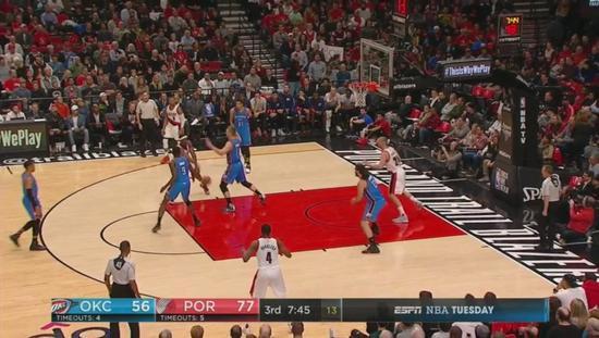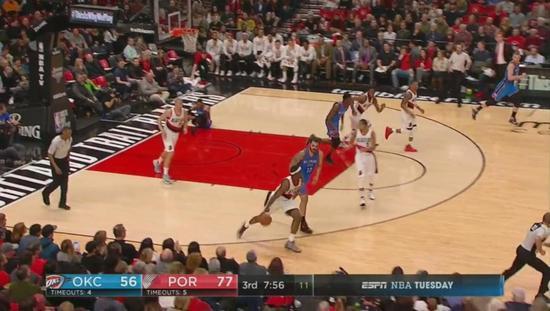 整个进攻过程中长达11秒的时间里开拓者5打4,足够给他们找到大空位三分出手的机会