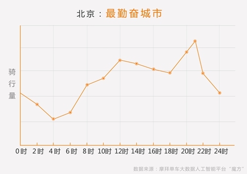在五一期间,共享单车承担更多的是游玩和聚会的出行工具,各地的骑行高峰较平日都有所延后。其中,北京依旧是"最勤奋"城市,第一个骑行高峰从平时8点左右延后到10点;而海口则"最悠闲"的城市,骑行高峰出现在晚上18点到21点。