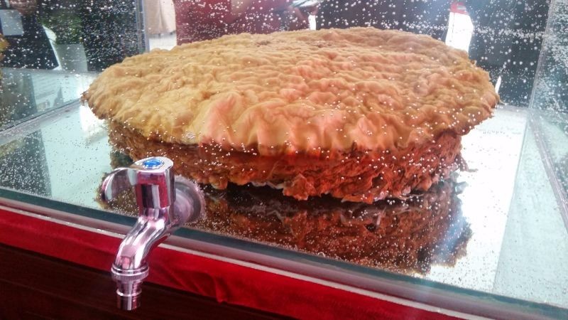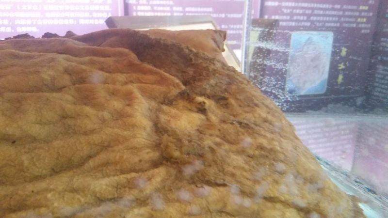 朝阳人杰地灵,物华天宝。自2001年起,我市相继发现了大小不一的十尊“太岁”。本次展出的是第七尊和第九尊,也是其中保存最完整的两尊。 第七尊是2013年10月1日清晨,李某在双塔区长宝乡梨树沟村牤牛河中发现,直径约45厘米,厚约13厘米,重约10公斤,呈圆柱状,有围沿,经长时间浸泡后,表皮呈淡黄色,肉质纯白色,用手触摸感觉皮质较硬,经专家签定为“太岁肉灵芝”。外形酷似生日蛋糕,实属罕见。第九尊是2014年9月9日,刘某在朝阳市龙城区大平房镇东平房村一树林草丛中发现,外表呈浅灰色,肉质白色,皮质较硬,用手触摸有弹性,直径约65厘米,厚约10厘米,重约21公斤,有围沿,形状完整,在其表面呈现形象逼真、双目炯炯有神的寿星脸庞形状。经辽宁省微生物研究院专家鉴定为“太岁肉灵芝”,年龄千岁以上,是朝阳目前发现的体积最大、重量最重、并呈现寿星脸庞形状的惊世“太岁”。