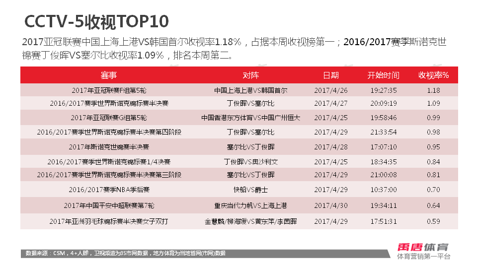 从禹唐的收视数据报告来看,丁俊晖与塞尔比半决赛第四阶段的收视率为0.98,在上周的所有比赛中排名第四位,鉴于比赛整体并不是在黄金时间播出,能够取得这样的成绩已经非常不错了。本场半决赛第一阶段的收视率为1.09,仅次于上港与首尔FC的亚冠比赛。即便是第三阶段集锦的重播收视率都达到了0.81。至少在这段时期,斯诺克成了国内最“火爆”的运动。