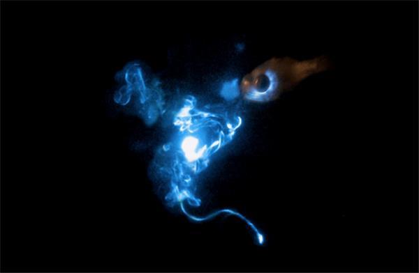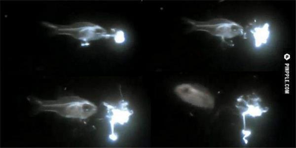 莫非,喷火鱼这种完全不科学的生物真的存在?!其实只要眼神不是太差,我们不难发现小鱼们并没有喷出熊熊烈火,而是吐出了一团云雾状的幽暗蓝光。所谓“3米多长的火焰”,只不过是少许发出蓝色荧光的液体。