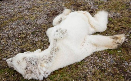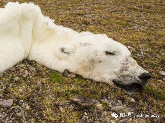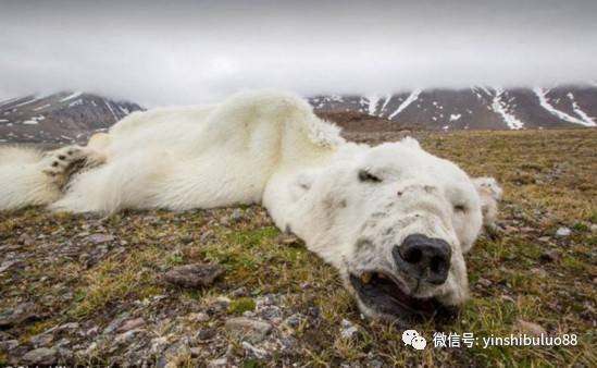科学家们发现的这头北极熊,身上没有第一点多余脂肪,全身饿的只剩下骨头被皮毛紧紧包裹。从它倒下的姿势可以看出在最后一刻它还在行走,希望可以找到一点吃的,挽救自己,可是......可是什么都没有,满目荒凉,只有瑟瑟凉风和它鼻孔喘出的最后一口气......