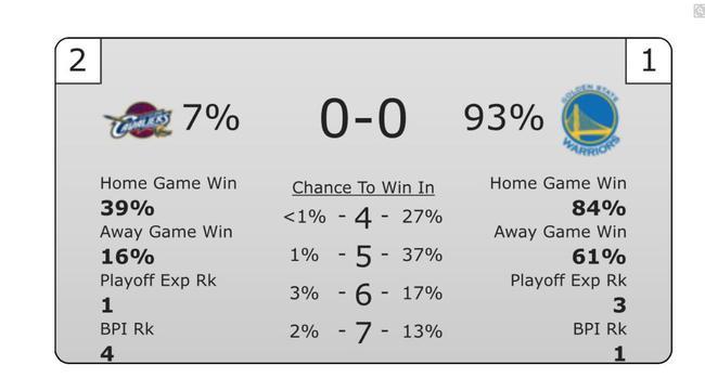 北京时间5月27日,据ESPN报道,随着骑士在东部决赛中4-1淘汰凯尔特人,他们和勇士将连续第三次在总决赛中相遇。BPI(篮球实力指数)认为勇士在总决赛击败骑士的概率达到93%。