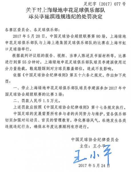 另外,5月24日中国足协官网公布了关于对上海绿地申花足球俱乐部队球员李建滨违规违纪的处罚决定,在上周末中超上海德比中,李建滨下半场比赛飞铲奥斯卡,被认定为使用过分力量抢截,被中国足协停赛三场罚款1.5万元。