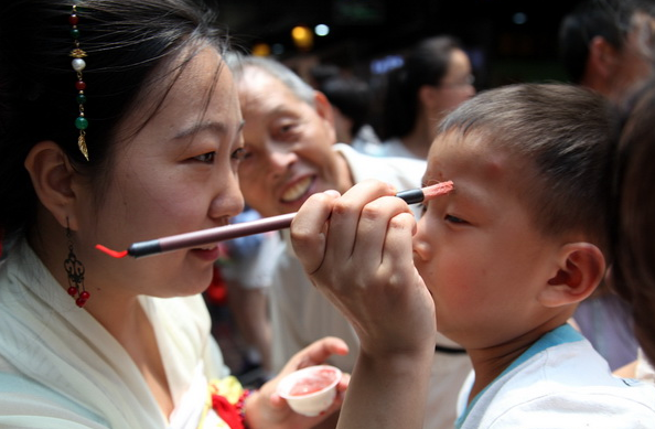 端午节时以雄黄涂抹小儿额头的习俗,云可驱避毒虫。典型的方法是用雄黄酒在小儿额头画“王”字,一借雄黄以驱毒,二借猛虎(“王”似虎的额纹,又虎为兽中之王,因以代虎)以镇邪。清富察敦祟《燕京岁时记》:“每至端阳,自初一日起,取雄黄合酒洒之,用涂小儿领及鼻耳间,以避毒物。”除在额头、鼻耳涂抹外,亦可涂抹他处,用意一致。山西《河曲县志》云:“端午,饮雄黄酒,用涂小儿额及两手、足心,……谓可却病延年。”