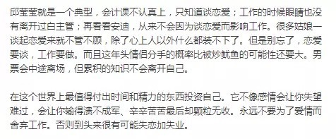 邱莹莹在家狂看成功学,安迪随便找了一篇文章,然后告诉她“这逻辑不通”。邱莹莹不但没有听进去,还怪安迪盛气凌人,看不起她。先不说市面上的很多鸡汤夹杂着大量的砒霜,让人喝死。失业的邱莹莹最该做的事情应该是去找工作而不是整天喝鸡汤。
