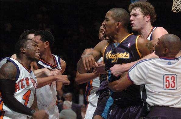 阿泰和大本:这两人在打球的时候都是球队的防守悍将,强悍的身体和火爆的性格,让他们之间产生了别样的火花。曾经奥本山宫殿的事件,成为了他们的成名作,除了他们,队友都参与了进来,打的整个球场变成了WWE,打红了眼的阿泰连球迷也不放过,冲上去一拳,直接打的对方当场就休克了!