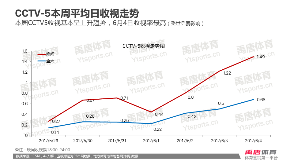 本周CCTV-5收视率相比上周大幅上升,全天平均收视0.35%,晚间平均收视0.8%;