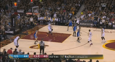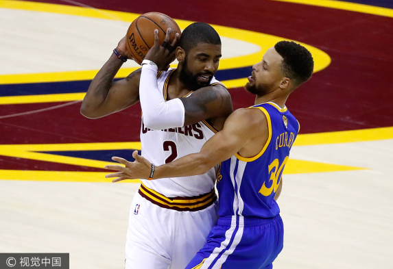 最后一攻詹姆斯突进去后,面对勇士的篮筐,勒布朗传球,他在行进间突分给了左底角的科沃尔——科沃尔这一晚投中了2个三分球,可此刻他的面前有人,库里始终没有离开他。科沃尔抬手三分不中。