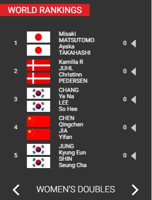 女双方面日本组合高桥礼华/松友美佐纪位列榜首,而中国组合陈清晨/贾一凡位列第4名,也是唯一一对杀进前五名的中国组合。