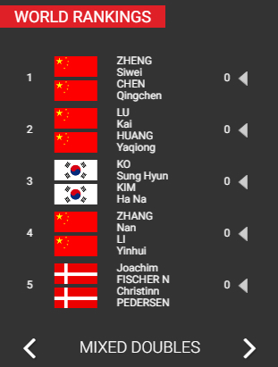 混双方面依然是中国的绝对优势项目,其中郑思维/陈清晨和鲁凯/黄雅琼组合分列前两名,另一对中国组合张楠/李茵晖则继续位列第4名。