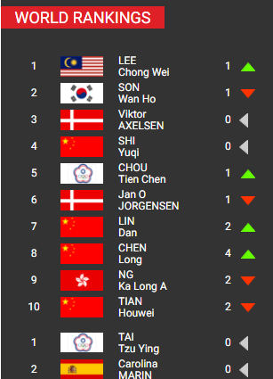男单方面的排名争夺日趋激烈,在上上周孙完虎超越李宗伟登顶,实现韩国球员首次登顶世界第一的历史纪录,并且结束李宗伟、林丹与谌龙3人长达13年霸占世界第一的垄断态势,但在上周李宗伟成功逆袭夺回榜首位置。