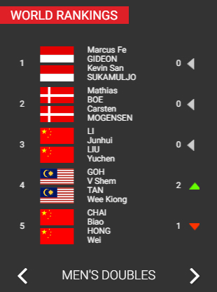 男双方面印尼组合吉迪昂/苏卡穆乔高居首位,排在第3名的是中国组合李俊慧/刘雨辰,而排在第5名的是另一对中国组合柴飚/洪炜。