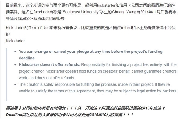 甚至还有人表示这根本就是一起利用众筹网站和信用卡公司之间的漏洞进行的诈骗项目,因为所谓创业团队设置的2015年底的Deadline足以让绝大多数信用卡公司无法处理2014年10月的诈骗。