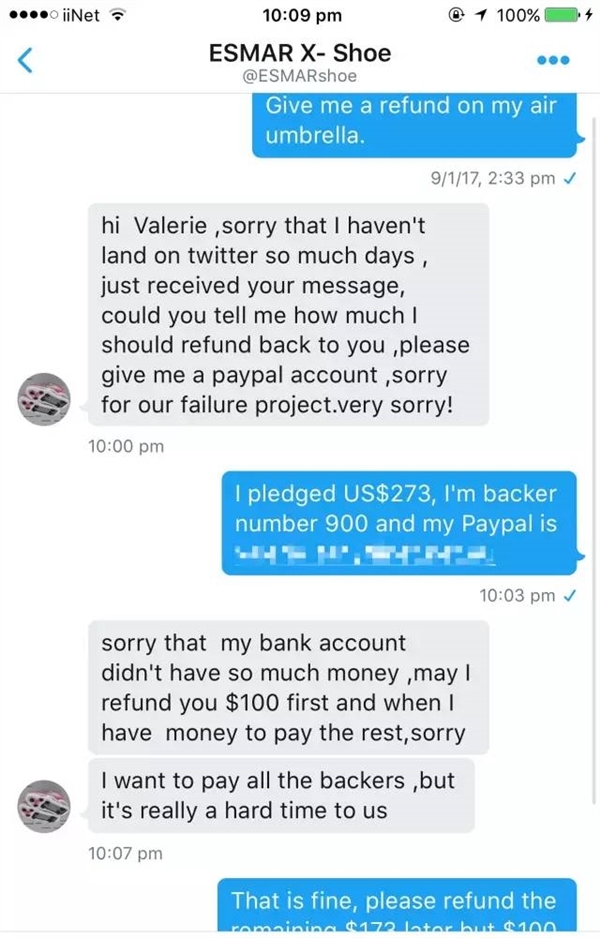 发起人:抱歉我的账户里没有这么多钱,能先退还100美元给你么,我们会慢慢把钱退换给所有的支持者的。。