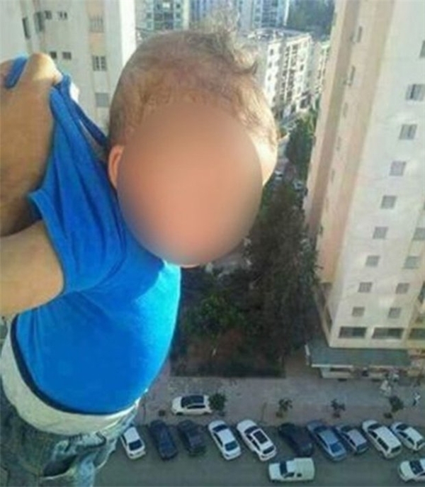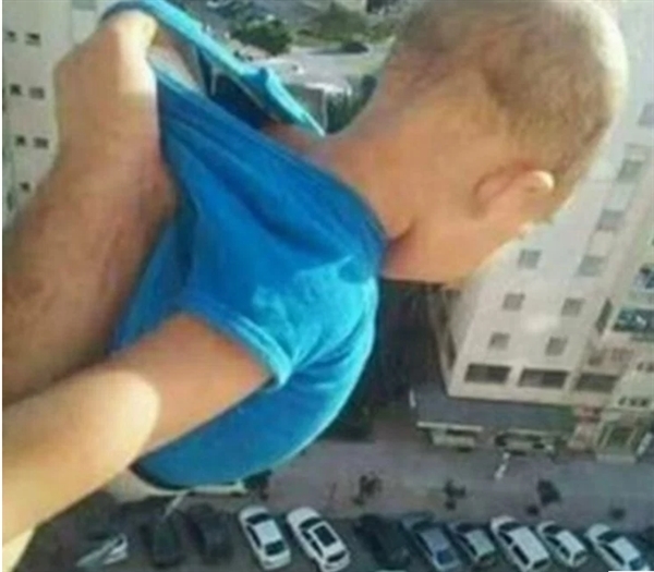 照片中的小男孩看起来只有一岁左右,蓝色T恤被男人一只大手紧拽着,悬空在高楼窗外,下面就是两边停满车辆的马路。由于照片被马赛克的缘故,无法辨别孩子当时惊恐的表情,但大家完全可以想象到。