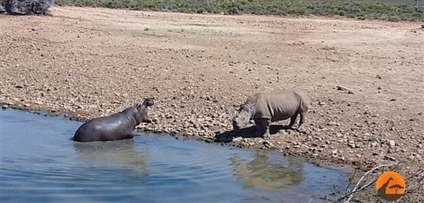 画面中,犀牛来到河马所在的水池旁,还没有机会喝到一口水,就被水池中的河马抓开大嘴警告。然而,犀牛似乎并没有意会河马的意思,或者根本无心理会,它可能已经渴到无法思考了。