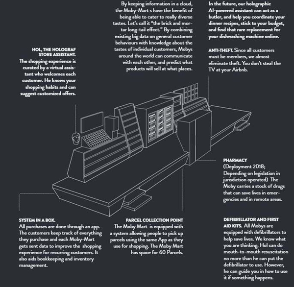 这就是 Moby 便利店的概念,是不是看起来比较超前?但这其中,很多想法现在都能实现。也许它的精髓在于,让「便利店更便利」这件事情有了更多实现的方法,比如它会自动移动,所以你就不用自己走过去,比如无人机运货,你在家就能享用商品。