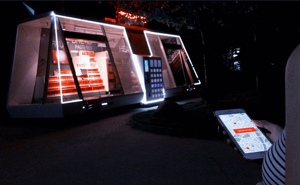 Moby 移动便利店从远处看就像一个不规则的玻璃盒子,在盒子里有各种各样的商品,而它有几个特性非常有未来感: