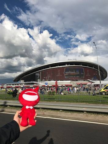 比赛日有免费的接驳车从喀山火车站出发,途经地标建筑喀山克林姆林宫,便可到达球场。需要注意的是,比赛结束后所有线路的免费接驳车都停在一起,并没有指示牌说明具体哪条线路开往哪里,然而相比其他城市,喀山的志愿者画风特别欢脱,沿路跟每个球迷击掌,沉迷于自嗨的节奏中无法自拔。
