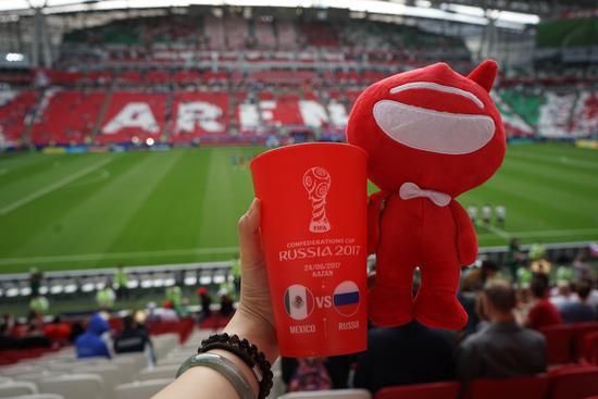 球场内的食物和饮料都是统一的菜单,食物有薯条、热狗、三明治和俄罗斯特色白菜包,饮料有碳酸饮料和啤酒,啤酒杯沿用了去年欧洲杯的创意,每一场比赛都有特制的塑料杯上面写着这一场比赛的举办地和比赛双方的名字,今年更是每一场有两款不同的杯子卖两种不同的酒,充分激发了球迷的集邮癖,每去看一场球都要带回个杯子证明我来过,真是高明的促销手段。