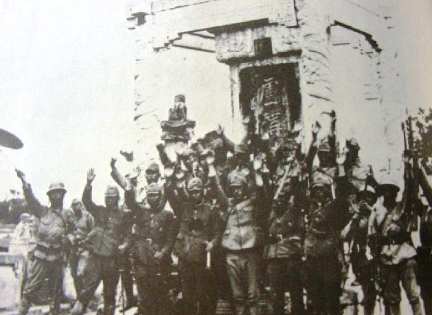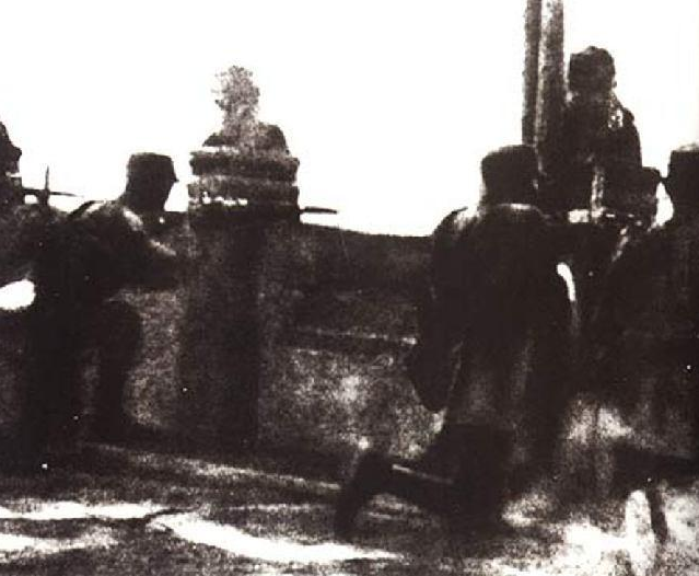 图为日军在卢沟晓月碑前庆祝胜利。
