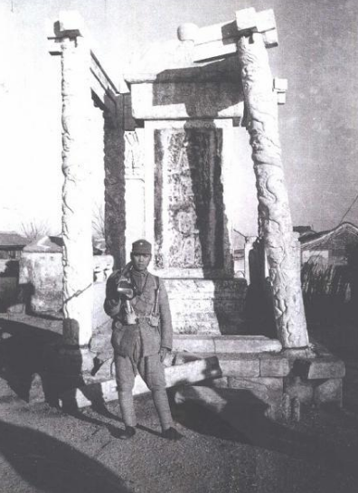 1945年,中国军人站立在卢沟晓月石碑前。