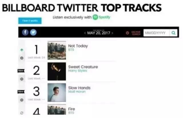 防弹少年团曾经还凭借歌曲《Not Today》成功登顶Billboard,击败了英国组合One Direction成员Harry Styles发布的歌曲《Sweet Creature》,以及Niall Horan发布的《Slow Hands》。另外,BTS在韩国也是大势,韩国权威音乐榜单Gaon的2017上半年统计中,防弹少年团专辑《YOU NEVER WALK ALONE》销量72.9295万张,位居专辑榜综合榜首。
