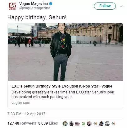同时,世勋也是被VOGUE官方送出生日祝福的Kpop明星,全世界的粉丝都疯了,感觉VOGUE已经好久没有这么高的转推数了,欧美大势认证。
