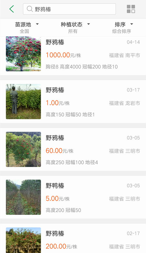 1.点击“苗木搜索”,在搜索栏种输入“野鸦椿”,丰富的相关苗木供应信息一收眼底。